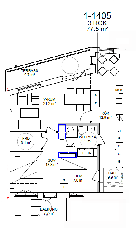 1-1405 – 77,5 kvm – 14.961 kr/mån – Balkong & terrass (ledig från 1/5)